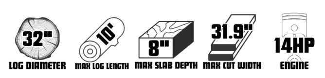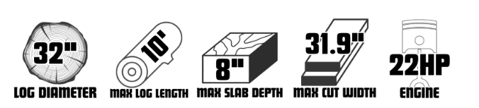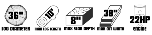 The 60 Series sawmills feature a rear cross support that strengthens the saw head carriage, making it more durable. The 26”, 32”, and 36” 60 series sawmills provide you with wider and deeper cuts than the 50 Series sawmills, and adjustable blade guides for greater precision. Each 60 Series sawmill is capable of cutting veneers up to 8” slabs and 10’ lengths, except for the 22” model which can cut up to 6.875” slabs.