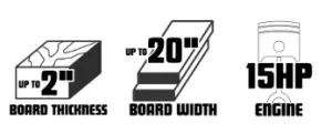 Large 6′ infeed and outfeed tables provide stable support for longer boards, while the machine accommodates lumber up to 2″ thick and 20″ wide. Integrated sawdust collector hoppers help manage debris and maintain a cleaner work area.